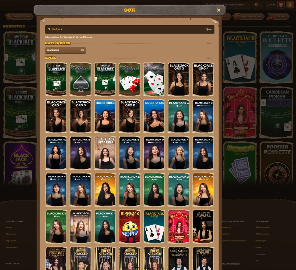 Blackjack har en tydelig plass i biblioteket. Her finner du både digitale spill og livebord, inkludert Classic Blackjack, European Blackjack, Power Blackjack og Free Bet Blackjack. For spillere som liker strategi og raske runder, fungerer disse bordene stabilt og med tydelig innsatsgrenser. Vi testet flere varianter, og spillene hadde konsekvent høy bildekvalitet og lav forsinkelse.