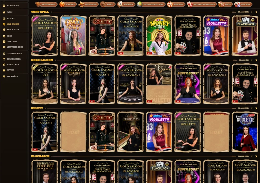 Hos Lizaro kan du bruke standard casinobonus også på livebord, men bidraget til omsetningskravet varierer. Klassiske bordspill teller 10%, mens enkelte gameshow-spill gir opptil 50%.