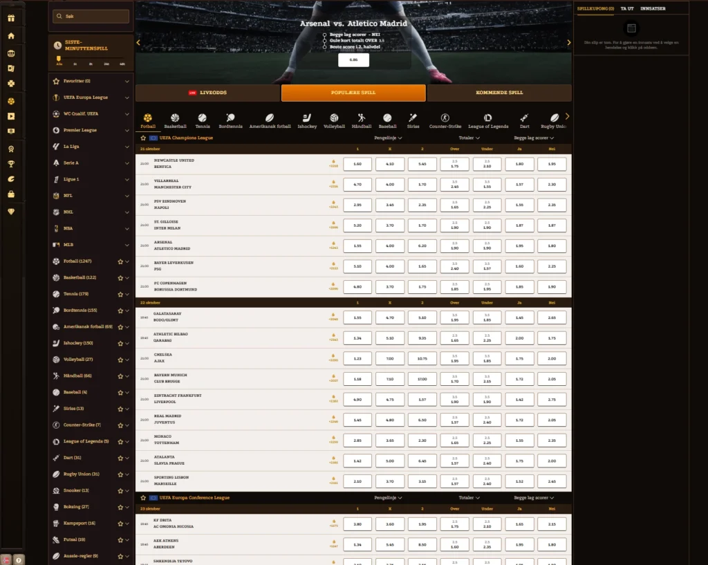 For norske spillere er det en fordel at oddsen vises i kroner (NOK), og at både innskudd og uttak kan gjøres med de samme metodene som i casinoet – inkludert kort, Revolut, MiFinity og kryptovaluta. Det gir et helhetlig system der du kan veksle mellom casino og sport uten separate kontoer.