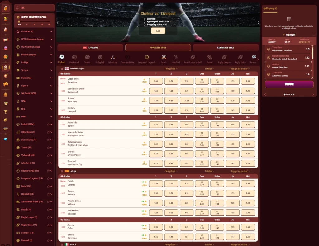 For deg som foretrekker esportsbetting finnes en egen fane med CS2, Dota 2, League of Legends og Valorant. Her kan du følge livekart, kampstatistikk og velge mellom både hovedlinjer og spesifikke markeder som kartvinnere eller antall runder.