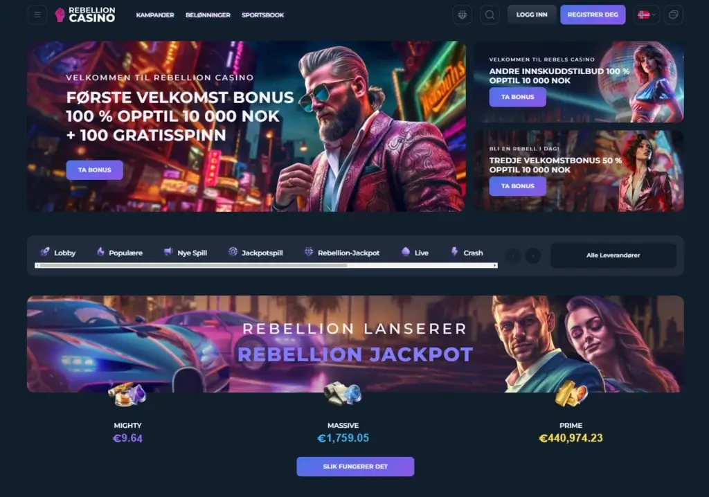 Rebellion Casino ble lansert i 2023 av spillselskapet Dama N.V. Når du registrerer en spillekonto her, får du tilgang til både casino og sportsbetting. Med over 4000 spill, fra spilleautomater til live casino-spill, sørger Rebellion for at du har tilgang til både nye og klassiske spill fra topprangerte spillutviklere. Velkomstpakken består av fem bonustilbud, inkludert 100% innskuddsbonus på de to første innskuddene dine, samt 100 gratisspinn på de tre neste innskuddene. Totalt kan du få 200% opptil 1.000 kr + 500 gratisspinn som en stor velkomstpakke. I tillegg finnes det ukentlig cashback på både casino- og live casino-spill, samt gratisspinn hver fredag. Sportsbook-seksjonen er også rik på bettingbonuser, med gratisspill og oddsboost-bonuser.