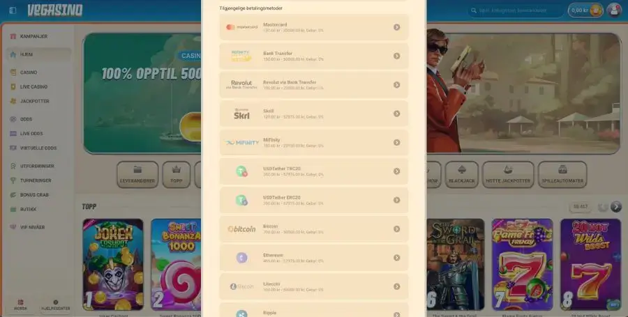 Hos Vegasino kan du gjennomføre innskudd med Mastercard, Paysafecard, Skrill, Neteller, MiFinity og kryptovaluta. For uttak støttes også bankoverføring. Transaksjonsgrensene er tilrettelagt både forsiktige spillere og storspillere.