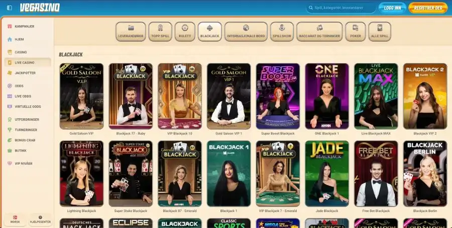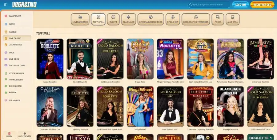I Vegasino sitt live casino er det et veldig bra utvalg av spill, men de lister ikke alle spillene som faktisk er tilgjengelige. Så for å se hele det komplette utvalget må du klikke deg inn i lobbyen til de ulike spillutviklerne. Det er mange spillstudioer med her, men de to største er Evolution og Pragmatic Play. For å se de anbefalte spillene innen hver spilltype kan du også se gjennom de ulike underkategoriene.