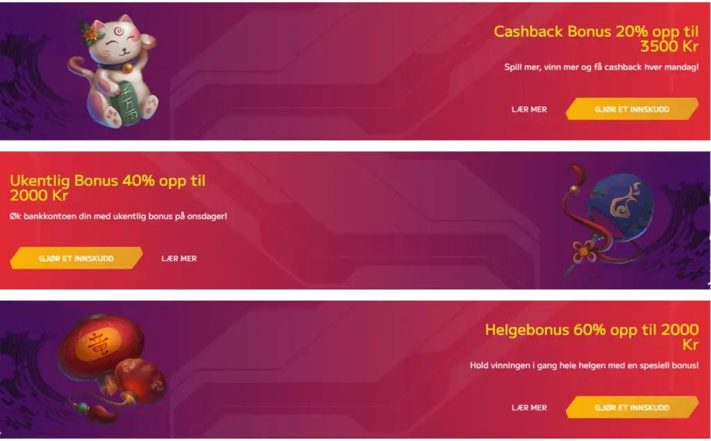 Midt i uken casinoet også en mulighet til å booste bonusbalansen med en 40% bonus opp til 2000 kr (no-stcky). Denne onsdagsbonusen er perfekt for å holde spenningen oppe og motivasjonen i gang.