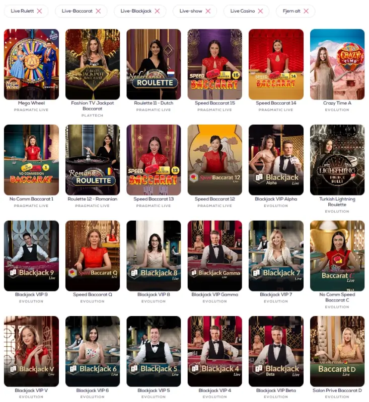 Blant live casinospillene finner du en rekke populære spill som Mega Wheel fra Pragmatic Live og Fashion TV Jackpot Baccarat fra Playtech. Pragmatic Live tilbyr også et variert utvalg av live baccarat og roulette, som Speed Baccarat og Roulette 11 – Dutch.