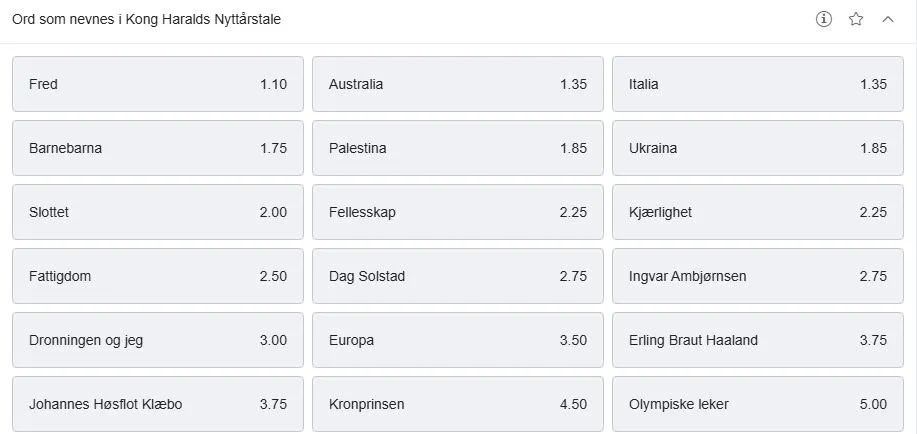 Det er noen ord som stikker seg ut som favoritter til å inkluderes i nyttårstalen 2025. Ord som fred (1,10), barnebarna (1,75), Palestina (1,85), slottet (2,00) og kjærlighet (2,25) er bare noen av ordene som gir lav odds på bettingsiden. Og selvsagt er «Dronningen og jeg» et utrykk som ofte benyttes og gir det 3,00 i odds. Prinsesse Ingrid Alexandra studerer for tiden i Australia, og at kongen nevner dette landet gir bare 1,35 i odds! Også Italia (1,35 i odds) står lavt i odds for å bli nevnt, blant annet på grunn av pavevalget tidligere i år. Pave Frans gir blant annet 15 i odds.