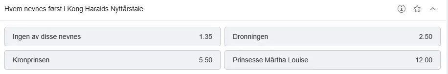 Det finnes også en mulighet til å tippe på hvem som nevnes først i kongens nyttårstale. Du kan nemlig tippe på om det er dronningen (2,50), kronprinsen (5,50) eller prinsesse Märtha Louise (12,00) som nevnes først i talen.