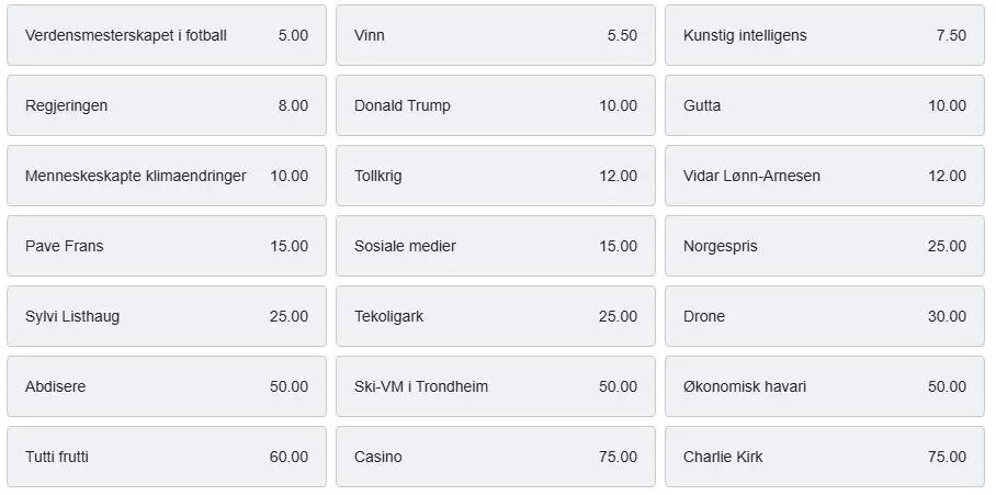 Et navn som gikk viralt under pavevalget tidligere i år, var den italienske kardinalen Pierbattista Pizzaballa. Mange håpet på pave Pizzaballa, men det ble til slutt Robert Francis Prevost, som ikke var blant favorittene inn mot valget. Du får hele 250 i odds på at Kongen nevner den Pizzaballa i talen. Andre ord som nevemagnet (500,00), Vass og knepp (500,00), gjerrige sunnmøringer (700,00) og Kjøh! (150,00) er blant de morsomme, men mindre sannsynlige vinnerne.