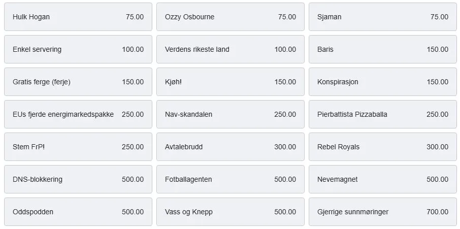 Av de politiske ordene er det nok Stem FrP! (250,00), avtalebrudd (300,00) og EUs fjerde energimarkedspakke (250,00) som er de mindre sannsynlige, mens også Nav-skandalen (250,00) er mulig å tippe på.