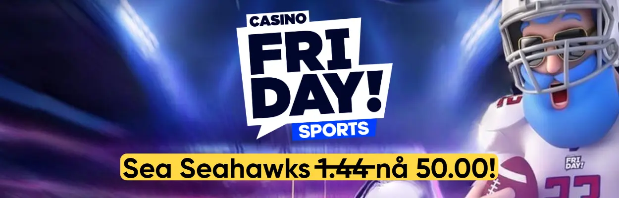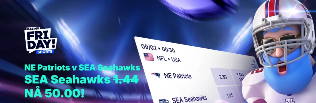 Natt til mandag spilles Super Bowl, og mange nordmenn kommer nok til å benke seg for å få med seg både en spennende kamp og et forrykende half time-show. Og takket være CasinoFriday kan du sikre deg en potensiell massiv gevinst på Super Bowl, det via deres ekstreme oddsboost. For bettingsiden har økt oddsen på at Seattle Seahawks vinner Super Bowl fra 1,44 til hele 50.00! Les mer om hvordan du kan få med deg denne gylne muligheten her.