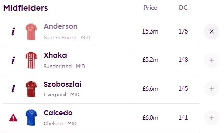 Chelseas midtbanegeneral Moses Caicedo (6,0) har sanket hele 58 poeng i FPL så langt, noe som gjør han til en av de 15 beste midtbanespillerne så langt. Det mye takket være 141 defensive involveringer (fjerde høyest på midtbanen). Men mot Arsenal fikk han direkte rødt kort og må stå over tre kamper. Hvilke spillere er naturlige arvtakere denne runden?