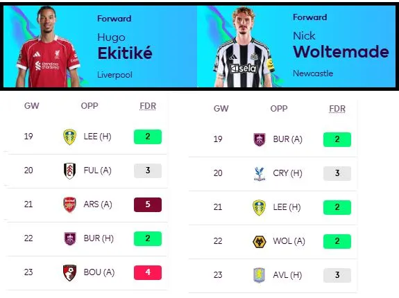 Woltemade står med 7 mål og 2 målgivende, inkludert en dobbel mot Chelsea i GW 17. Ekitiké står med 8 mål og 2 målgivende. Han har satt fem av målene i løpet av de fire siste kampene! Som vi ser har Woltemade det beste kampprogrammet, men Leeds og Fulham i de neste kampene, holder vi på Ekitiké enn så lenge. Men vi vurderer hardt å bytte ham ut foran GW 21.