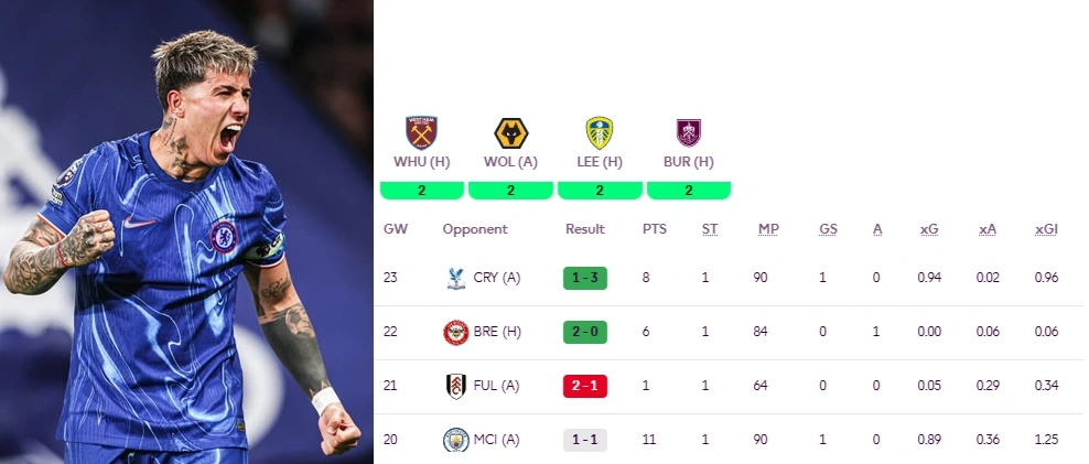 Mange FPL-spillere har ventet på at Cole Palmer skal spille seg tilbake i form. Men enn så lenge må vi fortsatt vente. Palmer har sikret seg fire mål og en målgivende, men måtte stå over sist grunnet muskelskade. Han er usikker også her, men i bakhånd har vi andre Chelsea-assets som kan levere i denne gode perioden. Enzo Fernandez er en av dem. Med fire målpoeng på fem kamper viser han at han virkelig er i form. Og tallene er ofte gode for midtbanespilleren.