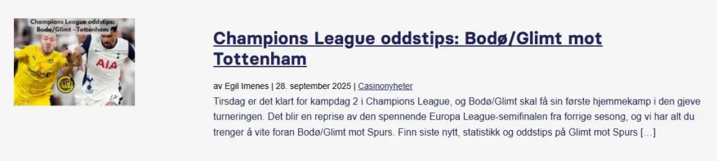Vi er kommet frem til kampdag 2 i Champions League 2025/26, og vi har igjen samlet våre beste Champions League betting tips på noen av de aller mest spennende kampene. Finn oddstips på Barcelona mot PSG, Glimt mot Spurs, målscorertips og masse annet i vår Champions League oddstips-artikkel denne uken. Les deg også opp på siste nytt om skader, lagoppstillinger, statistikk og andre nyheter om Champions League-lagene.