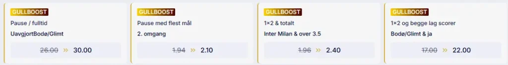 Vi tror også det kan bli målrikt i kampen, og linjen er satt til over 3,5 hos mange bettingsider. Vi legger merke til at Glimt ofte skårer sent i kampene (i alle bortsett fra én bortekamp i CL), og tror de kan få muligheten til en kontring eller to utover i andreomgangen. Kombinerer vi over 2,5 mål og Bodø/Glimt skårer i andreomgang, får vi hele 2,71 i odds hos bettingsiden CasinoFriday. Her kan du også finne gullboost på kampen til opptil 30 i odds. Nedenfor finner du et utvalg av økt odds på Glimt-kampen. Bruk lenken for å finne ut mer om deres oddsboost og oddstilbud.
