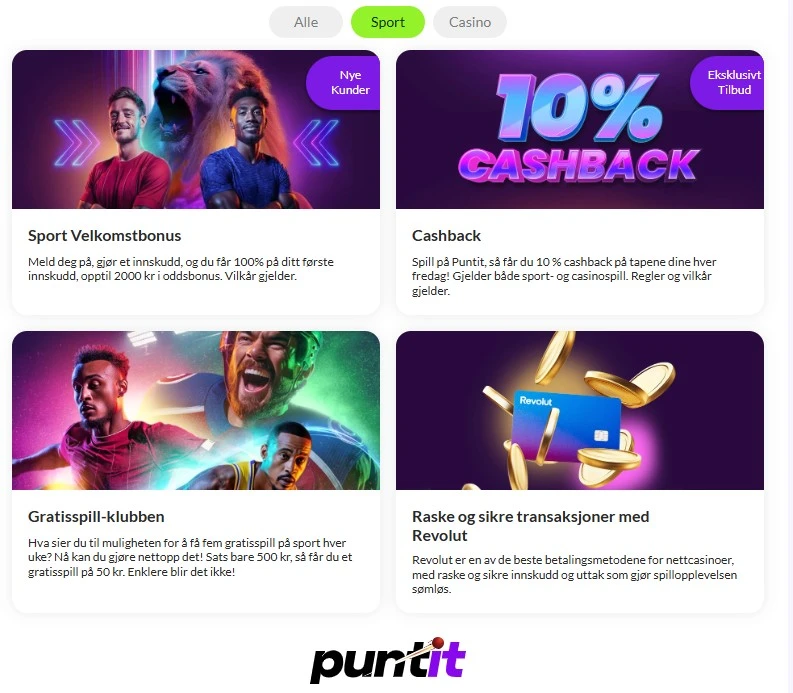 Bettingsiden Puntit er en oddsside som tilbyr nye spillere muligheten til å hente ut en 100 % oddsbonus på opptil 2000 kr. Samtidig finner du gratisspill-klubben, der du potensielt kan hente ut fem gratisspill hver eneste uke! Les mer om Puntits oddstilbud og vilkår via lenken nedenfor.