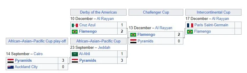 I «Derby of Americas» vant Flamengo mot Cruz Azul fra Mexico, og dermed ble de motstanderen til Pyramids. I den såkalte Challenger Cup vant Flamengo 2-0 over Pyramids og kvalifiserte seg til finalen mot PSG.