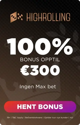 Highrolling er et casino som har holdt på noen år allerede. Noen kjenner det kanskje under navnet Storspiller, som de hadde frem til nylig. Nå tilbyr de en 100 % bonus uten omsetningskrav på opptil 5000 kr til nye spillere. For å hente denne bonusen må du gjøre et innskudd på minst 500 kr, og maksinnsats med aktiv bonus er 50 % av bonusmidlene. Det vil si at et innskudd på 3000 kr gir 3000 kr i bonus og en maksinnsats på 1500 kr per spill. Du bruker dine egne penger og gevinster fra disse først, deretter bonusmidler og gevinster fra bonusmidler når du spiller.