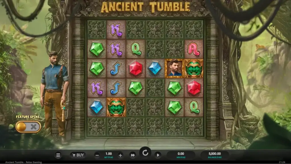 Ancient Tumble en spennende spilleautomat som tar deg med på skattejakt i den sør-amerikanske jungelen. Dette Relax-spillet er inspirert av den gamle aztekerkulturen, og selve spillfeltet er plassert ved inngangen til et gammelt tempel. Klarer du å finne åpningen til tempelet, kommer du inn i et gigantisk skattkammer med gull så langt øyet kan se.