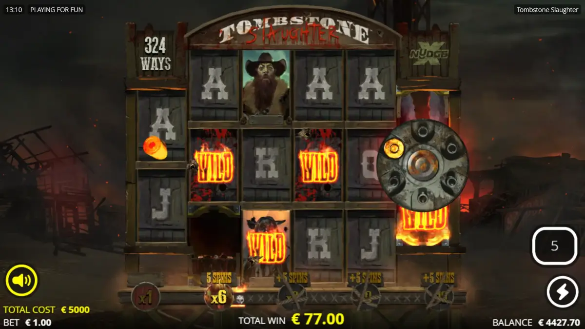 Det siste hjulet er imidlertid ikke som de andre. Her kan det, akkurat som i Tombstone RIP, kun lande stablede symboler. Hvis symbolet lander bare delvis synlig, blir hjulet deaktivert. Merk også at det kun kan lande revolver- og karaktersymboler her, og altså ingen lavverdisymboler. For å vinne, må du ha tre eller flere like på etterfølgende hjul fra venstre, uansett posisjon. Dette gir totalt 324 gevinstveier.