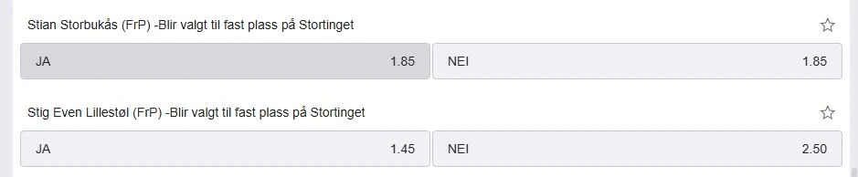 En odds på Stortingsvalget 2025 som nettopp er lagt ut, er oddsen på hvem som får plass på Stortinget. En rekke politikere er her representert med odds på om de får eller ikke får plass på Stortinget. Det inkluderer Frøya Skjold Sjursæther (MDG), Geir Pollestad (Sp), Harry Valderhaug (KrF), Mamhoud Farahmand (H), Sandra Borch (Sp), Sandra Bruflot (H), Irene Ijala (Pasientfokus), Anette Carnarius Elseth (FrP), Stian Storbukås (FrP), Terje Kollbotn (R) og en rekke andre politikere.