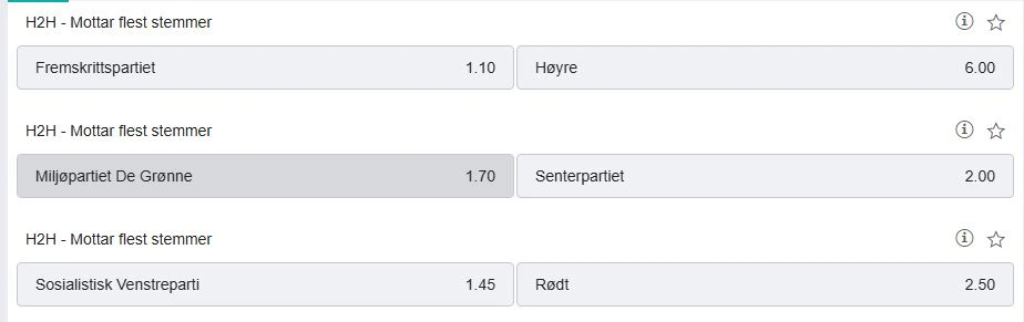 Det er også lagt ut odds på flere H2H-markeder for antall stemmer og seter. Du kan for eksempel tippe på om det er Miljøpartiet De Grønne (odds 1,70) eller Senterpartiet (odds 2,00) som får flest stemmer i valget. H2H-spill finnes det også på SV/Rødt, KrF/Venstre med flere